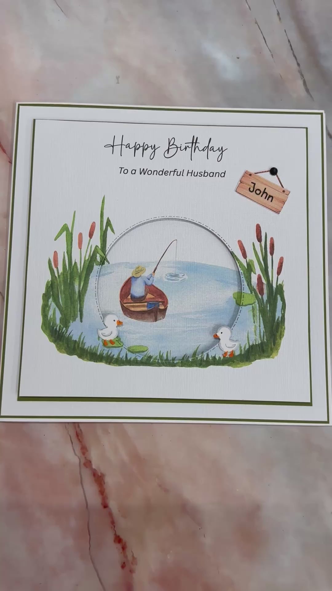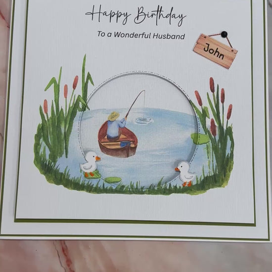 This large luxury personalised handmade card features a fisherman that brings a unique, tactile charm to any birthday greeting. Showcasing cute ducklings arranged around a pond. this card offers a standout alternative to traditional birthday wishes.