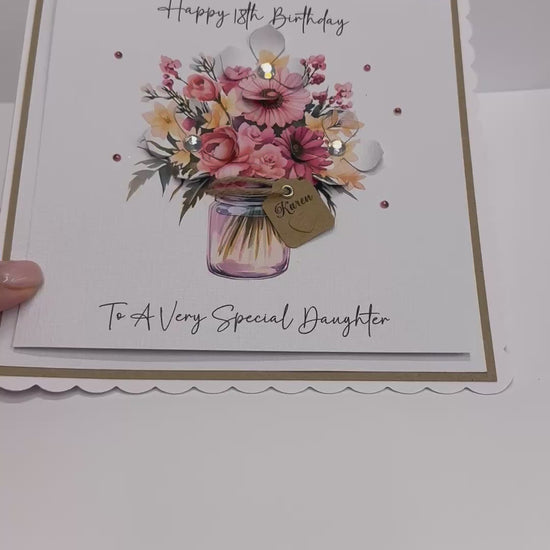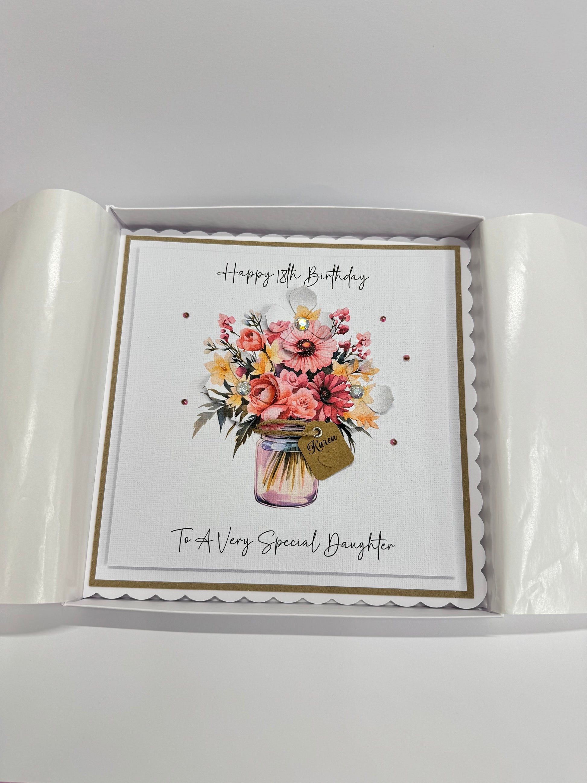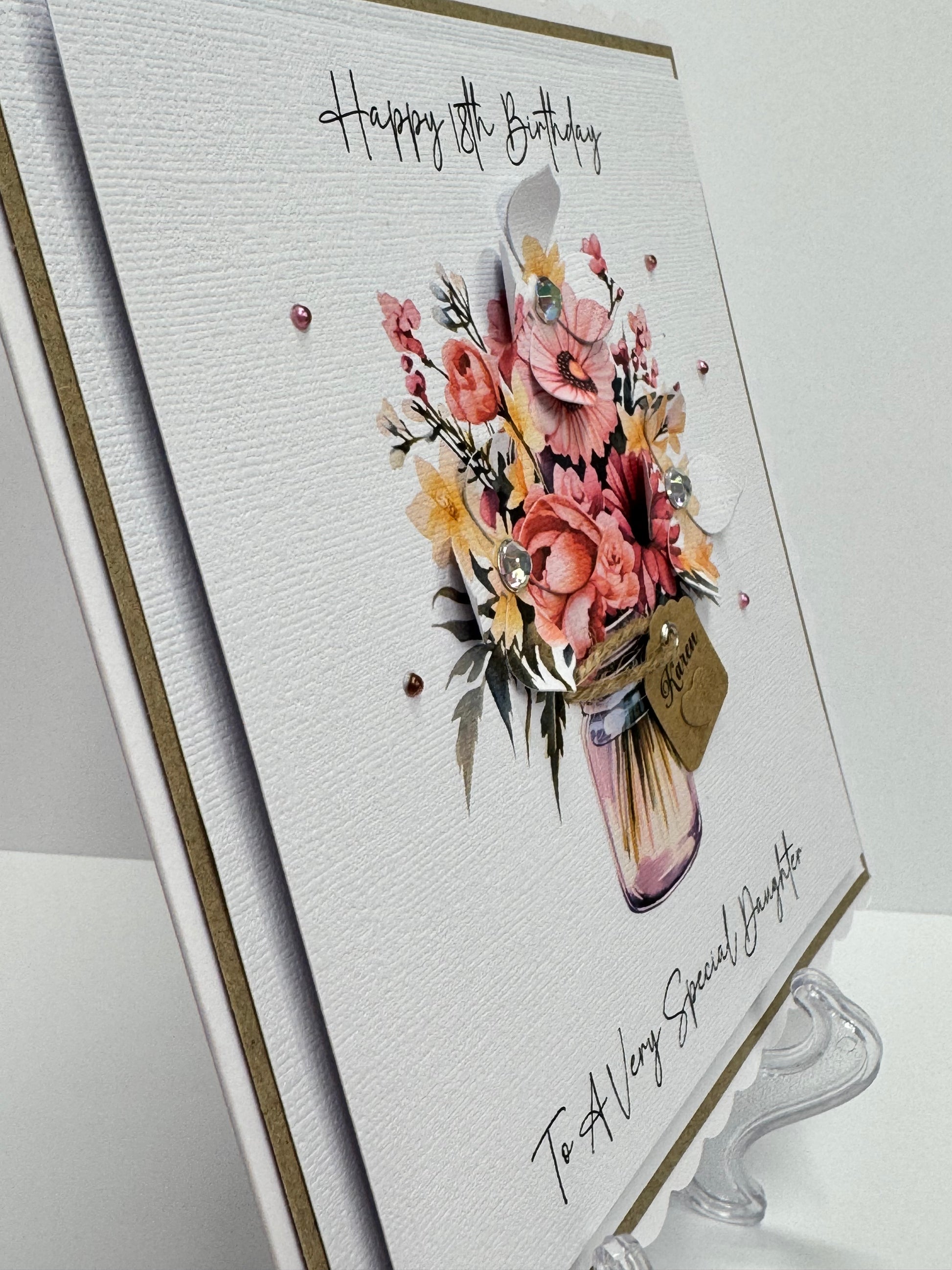 Crafted from high-quality cardstock and delicate layered paper flowers, this greeting card is meticulously handmade to ensure durability and stunning detail. The dimensional florals and sparkling rhinestones add texture and elegance, while the personalised jar bouquet design creates a charming keepsake. Perfect for anyone who appreciates thoughtful craftsmanship and wants to give a birthday greeting that lasts long after the day ends.