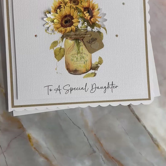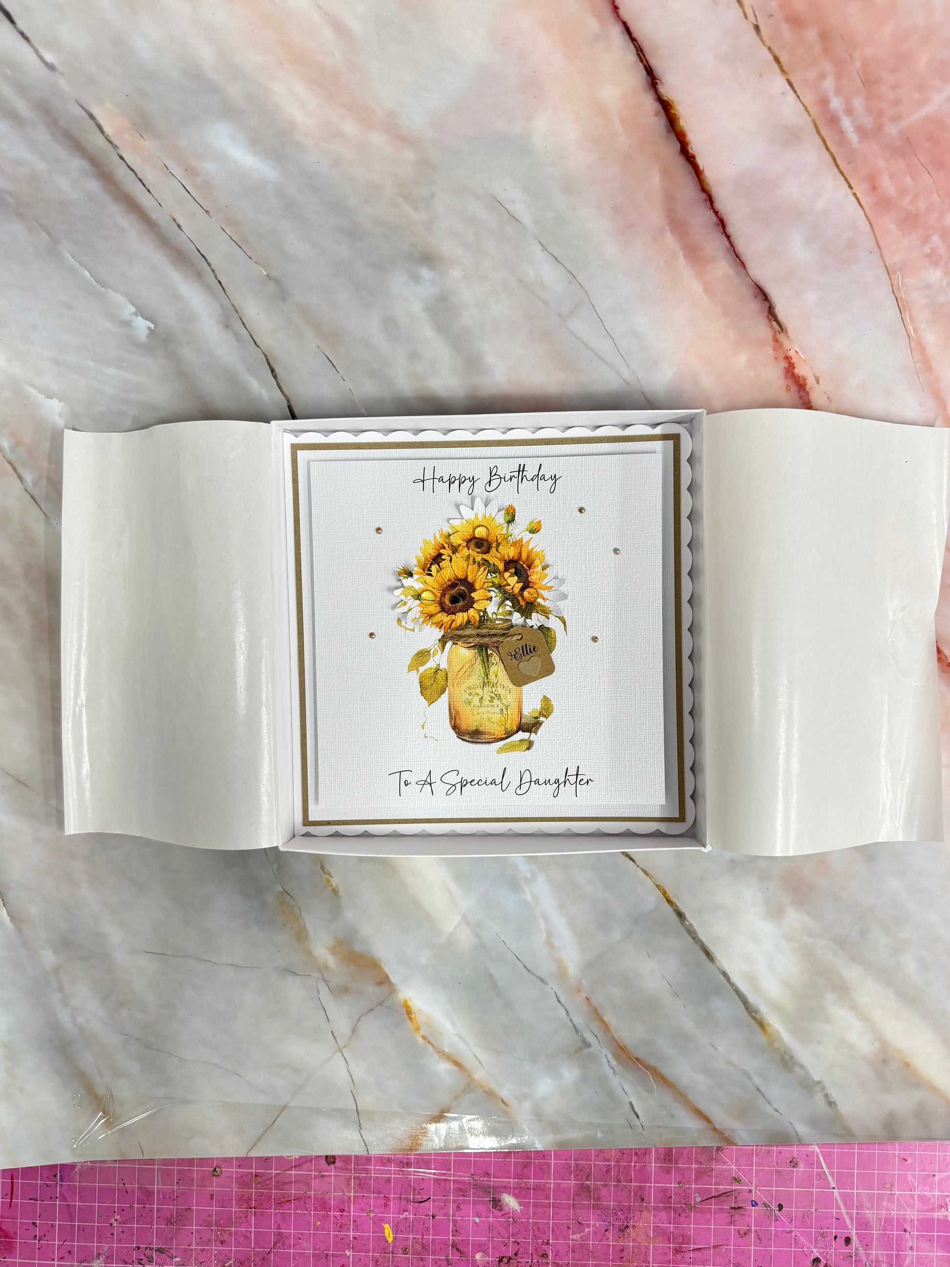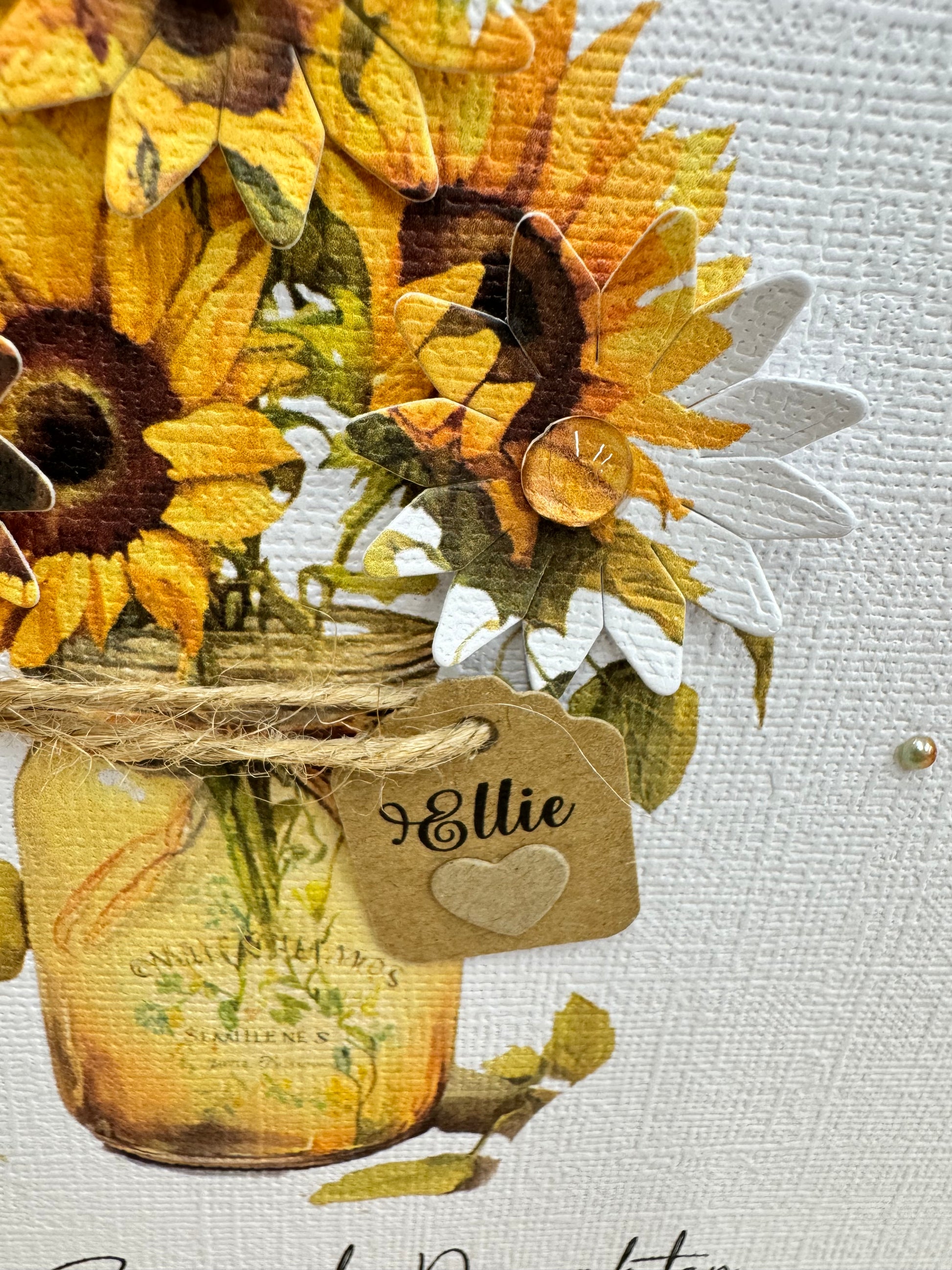 Celebrate a loved one’s special day with this unique Birthday card featuring an 7" or 8" large luxury personalised sunflower jar bouquet, perfectly captured in the image with vibrant 3D sunflowers and heartfelt birthday greetings. Unlike ordinary cards, this handmade piece comes beautifully presented in a envelope or box, making it a memorable keepsake for milestones like 18th, 21st, or 30th birthdays.